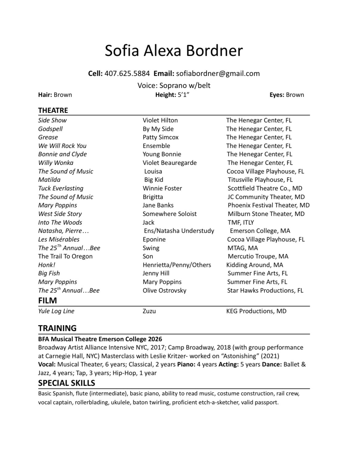 She is currently a senior Musical Theatre major at Emerson College, earning her BFA in Musical Theatre. Her training has strengthened her commitment to collaborative storytelling and deepened her love for creating meaningful, joy-filled work.
